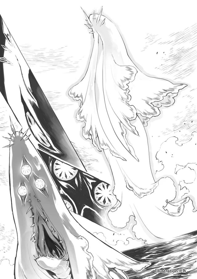 “Değil mi? Ayrıca, genç olsa bile, o yine de bir leviathan. Monokera gibi daha küçük türlerin yavruları bile insanlardan çok daha büyük ve güçlüdür. Metal plakaları kesebilen testere gibi organları vardır. Ve bir Musukura yavrusu başa çıkılamayacak kadar güçlüdür. Kim ona yaklaşırsa, anında yanarak kül olur… Ve öncelikle…”