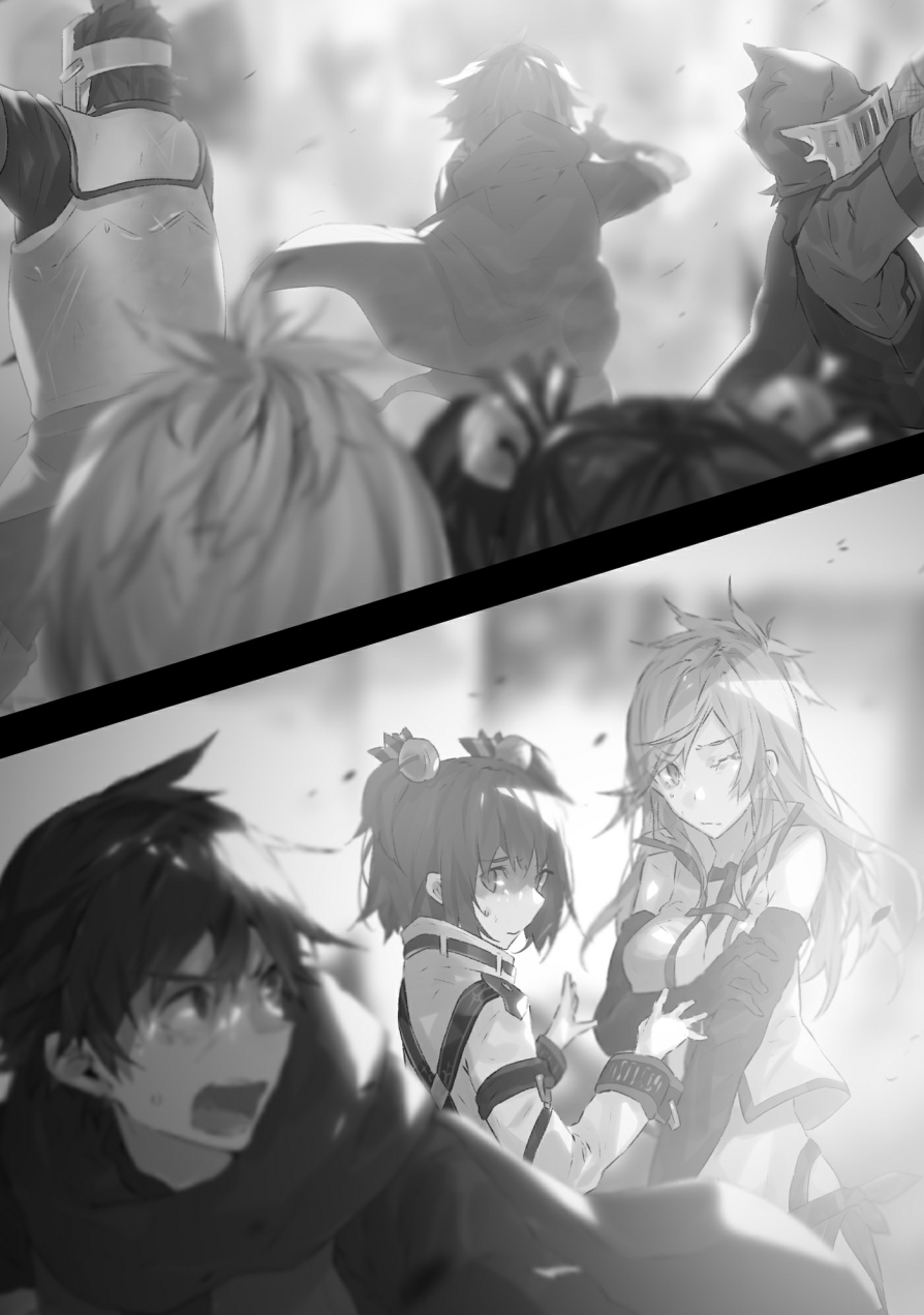 Haruhiro bir şekilde kalkanını kaldırmayı başardı. Kalenin girişine ulaşması için geçen sürede, kalkanına birkaç ok saplandı.