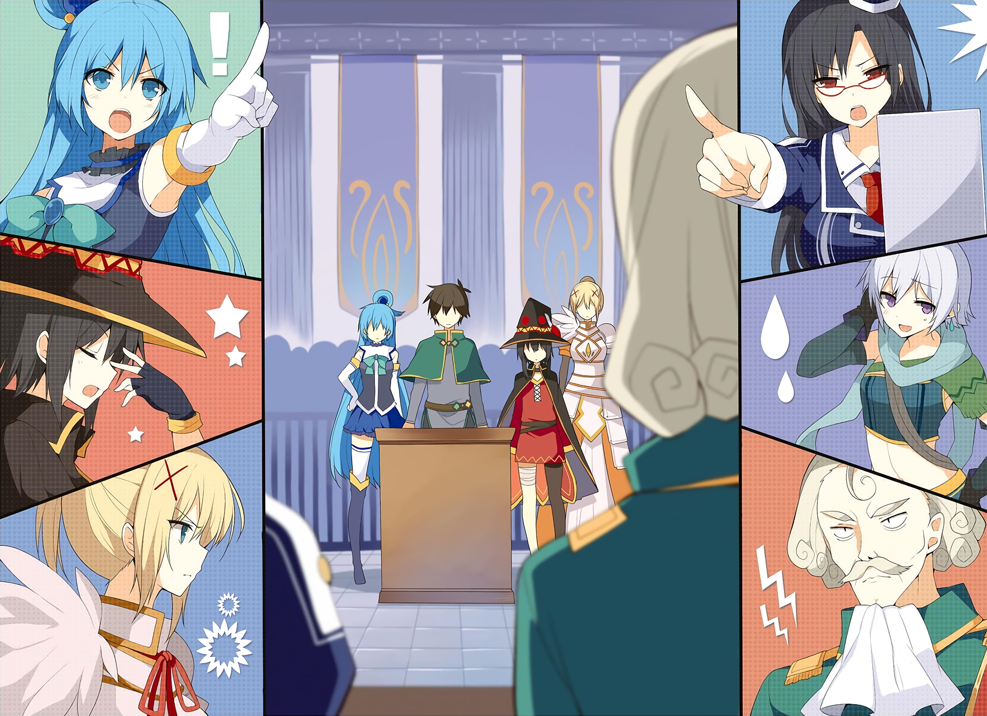 Yargıç sonunda kendini kaybetti ve tokmağı fırlatırken kükredi. Muhafızlar Megumin ve Aqua’yı sürükleyerek götürürken aniden-