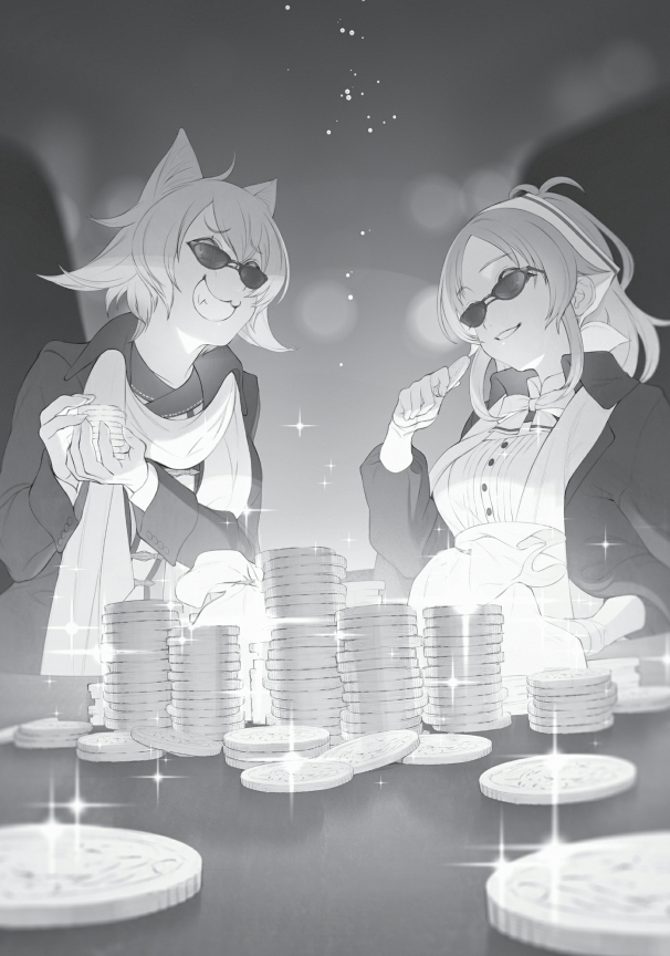 “Mewhahaha! Bu da danışmanlık ücreti, mew.” Kedi kulaklı kadın, altın paralardan oluşan mini kulelerden birinin üzerinden geçti. Her yığında muhtemelen beş ya da altı sikke vardı. “Bununla, umarım benimle çalışmaya devam etmeni bekleyebilirim, değil mi?”